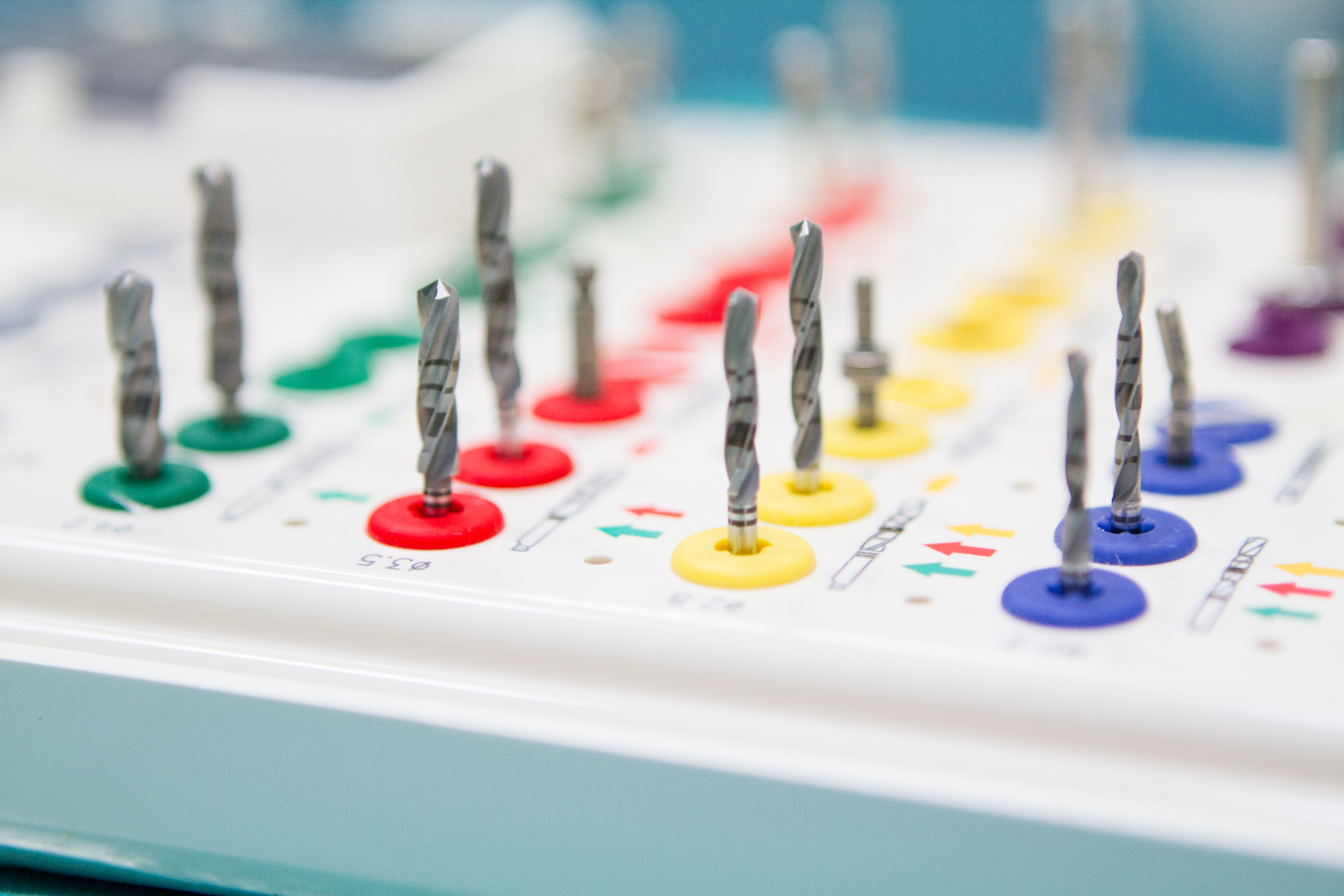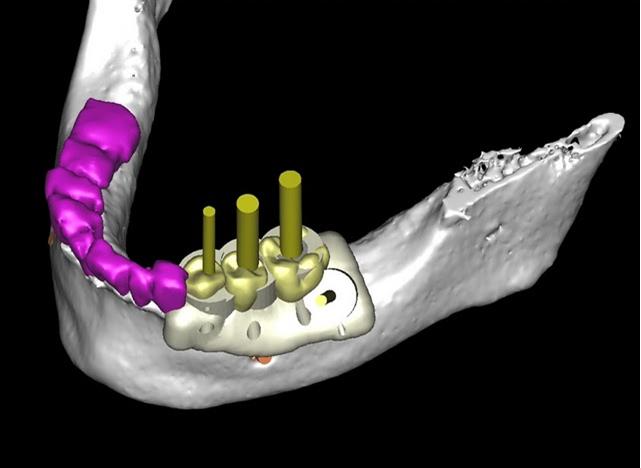 A questa fase di ispezione e progettazione segue la creazione di una “dima chirurgica”, ovvero una mascherina di precisione che riproduce la posizione degli impianti simulata al computer: la dima viene quindi introdotta nel cavo orale per guidare la fresa nella realizzazione del “sito implantare”, lo spazio preciso nel quale verrà inserito l’impianto ad hoc precedentemente progettato.